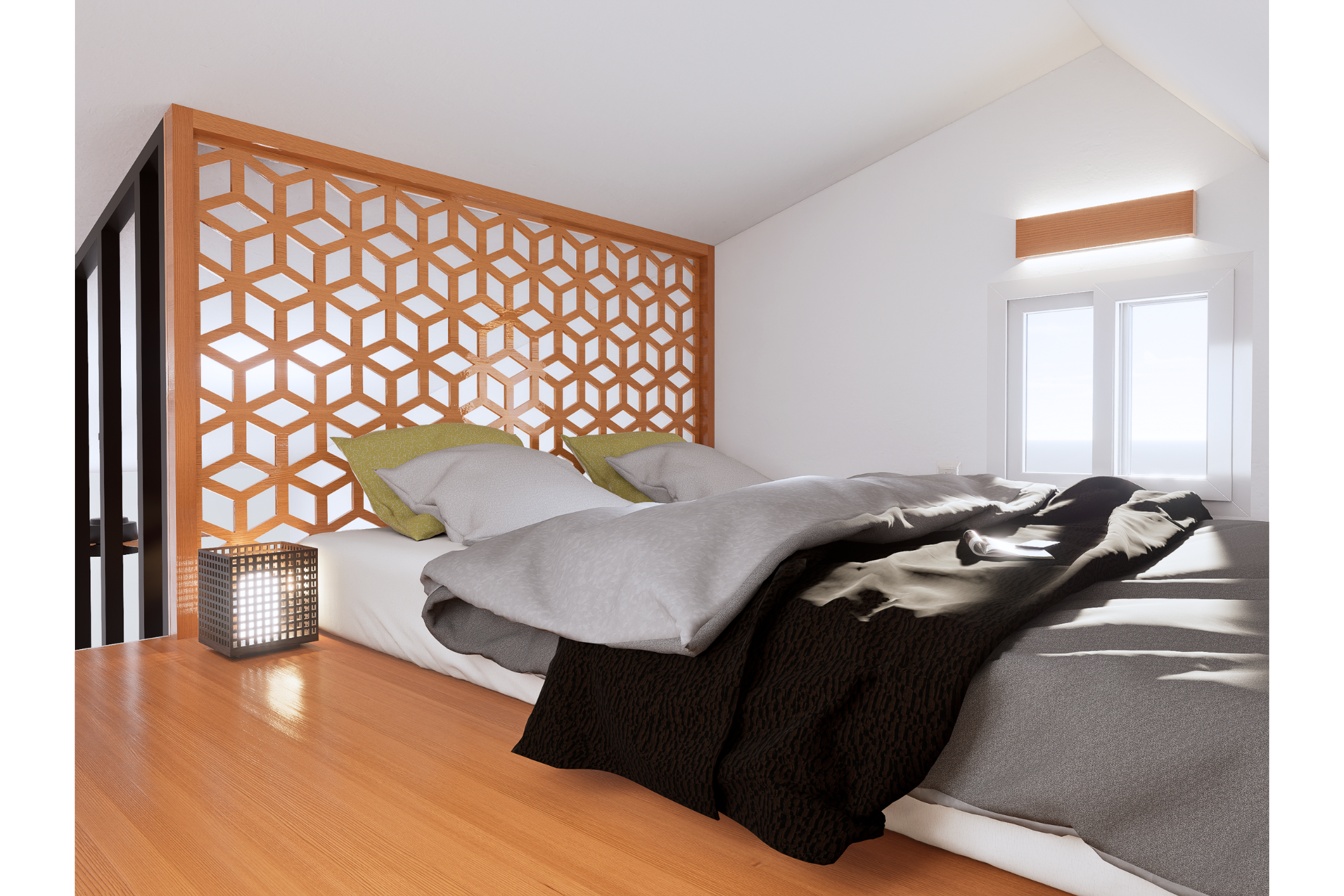 | Loft bedroom with living and dining | |
