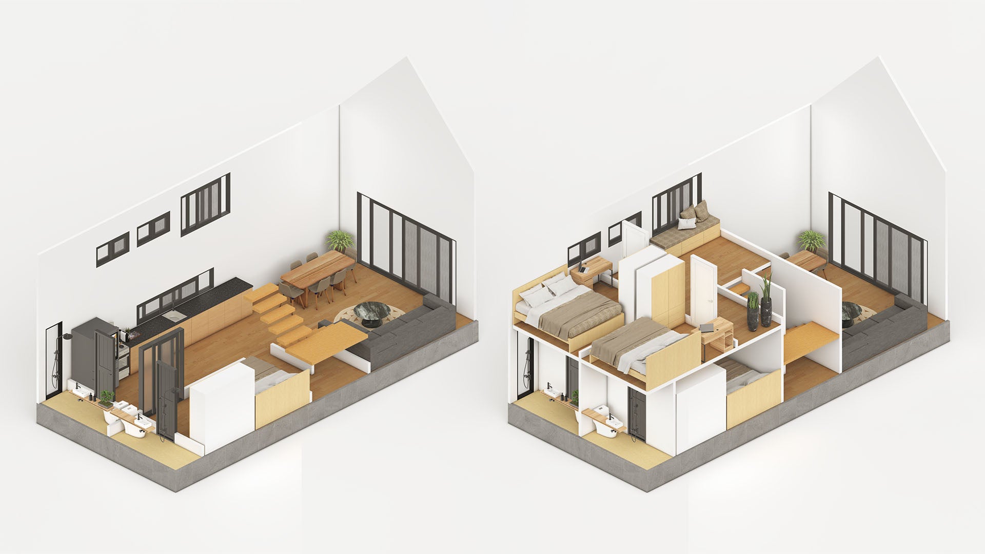 A two-story, fully customizable three-bedroom home designed for a family of six